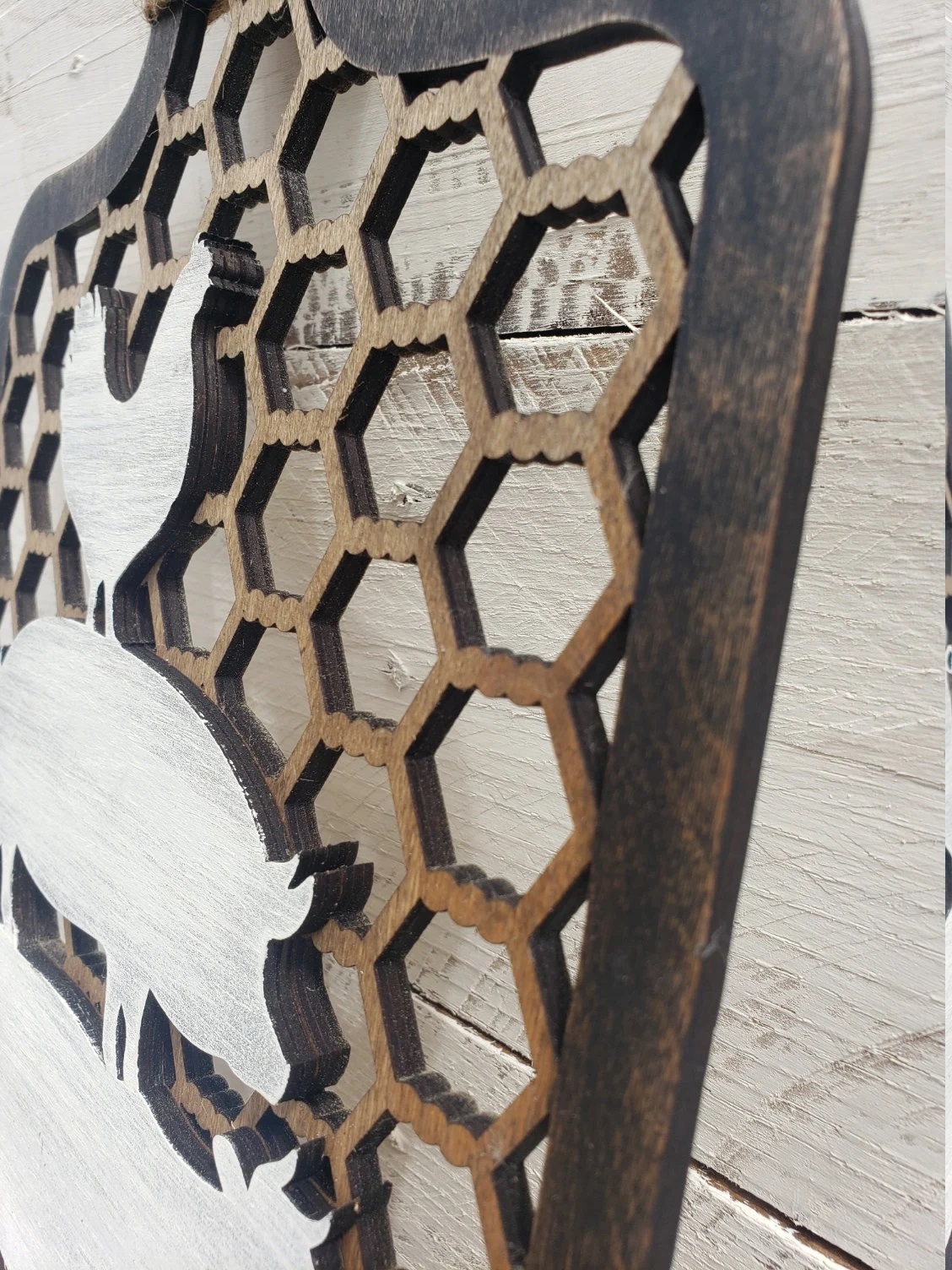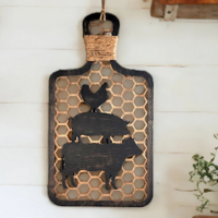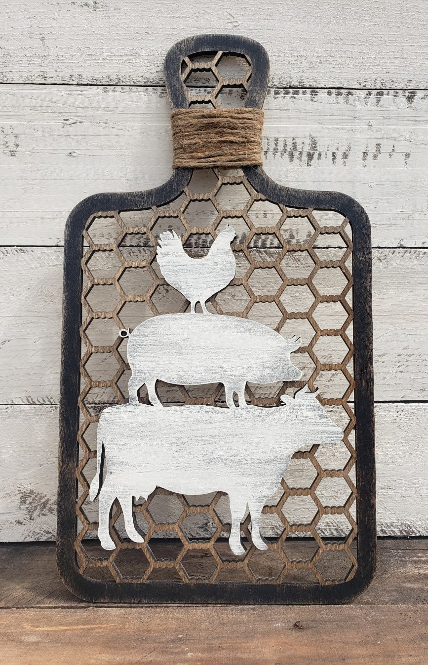 Add to your farmhouse look with this rustic farmhouse style decorative wood cutting board. From the look alike chicken wire to the down home stacked farm animals, it is sure to be a great addition to your decor!