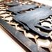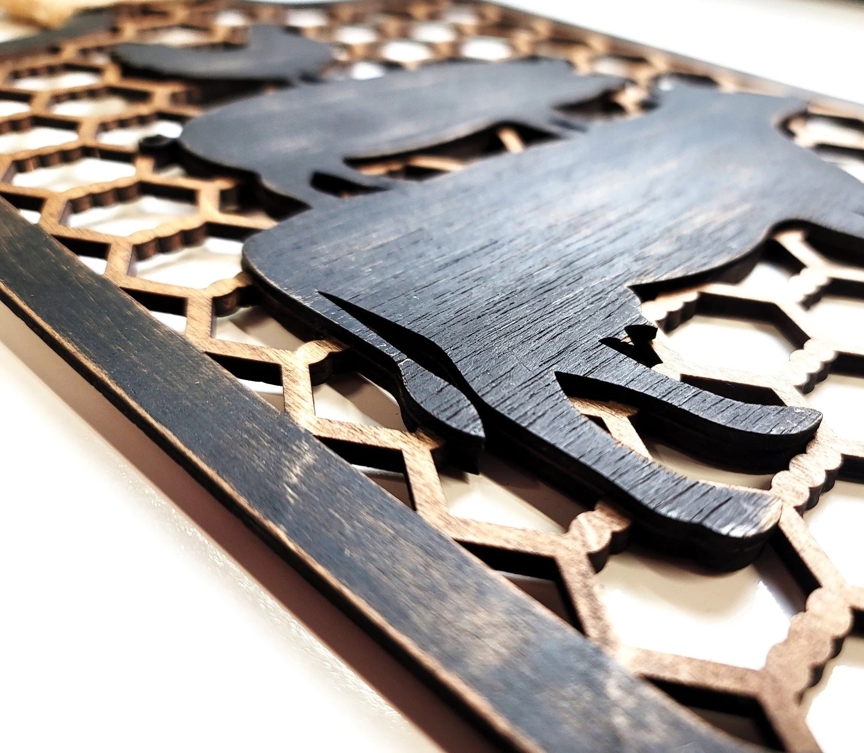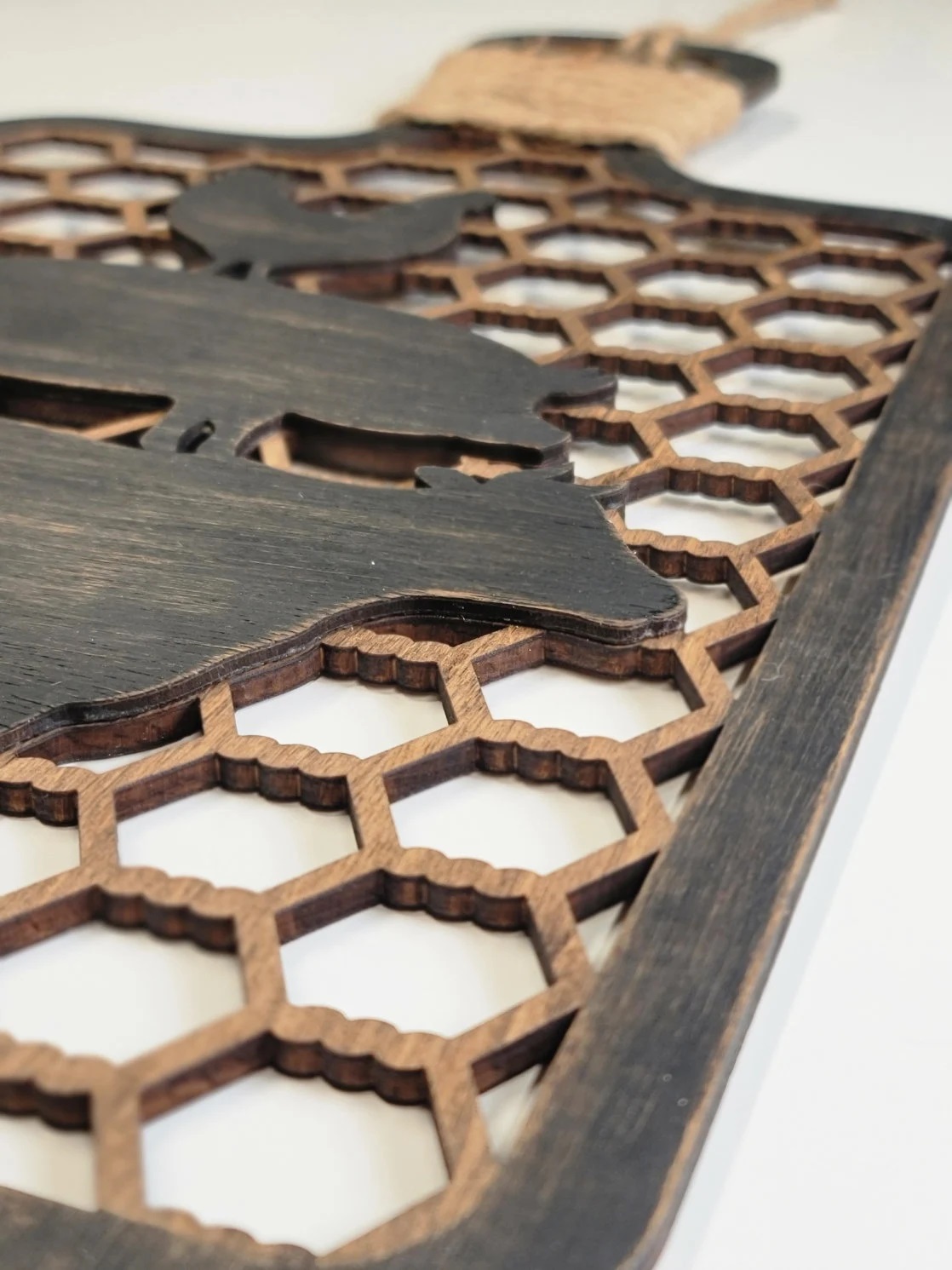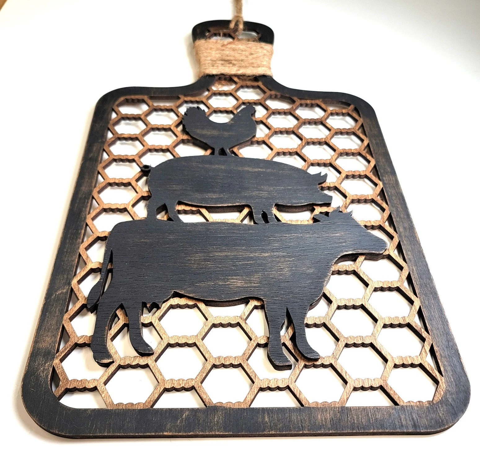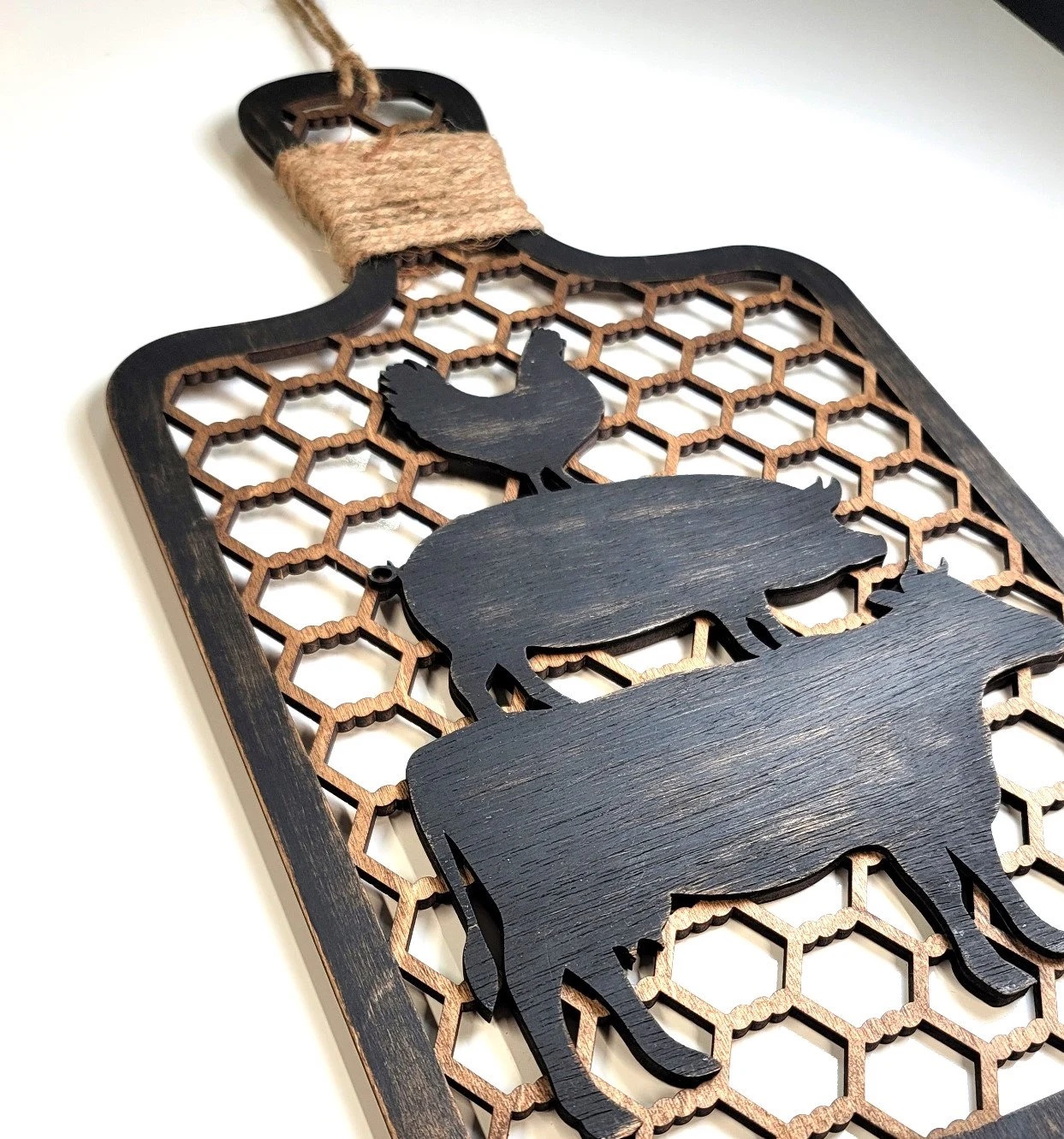 The decorative cutting board is laser cut from birch or maple wood . I then paint the board edges black and distress the painted area giving that worn over time look. The entire board is then stained. The stacked animals are cut from a thinner wood that I have hand painted, sanded and attached to give the 3D or raised look. Final step is to wrap the handle in jute and add the hanger.