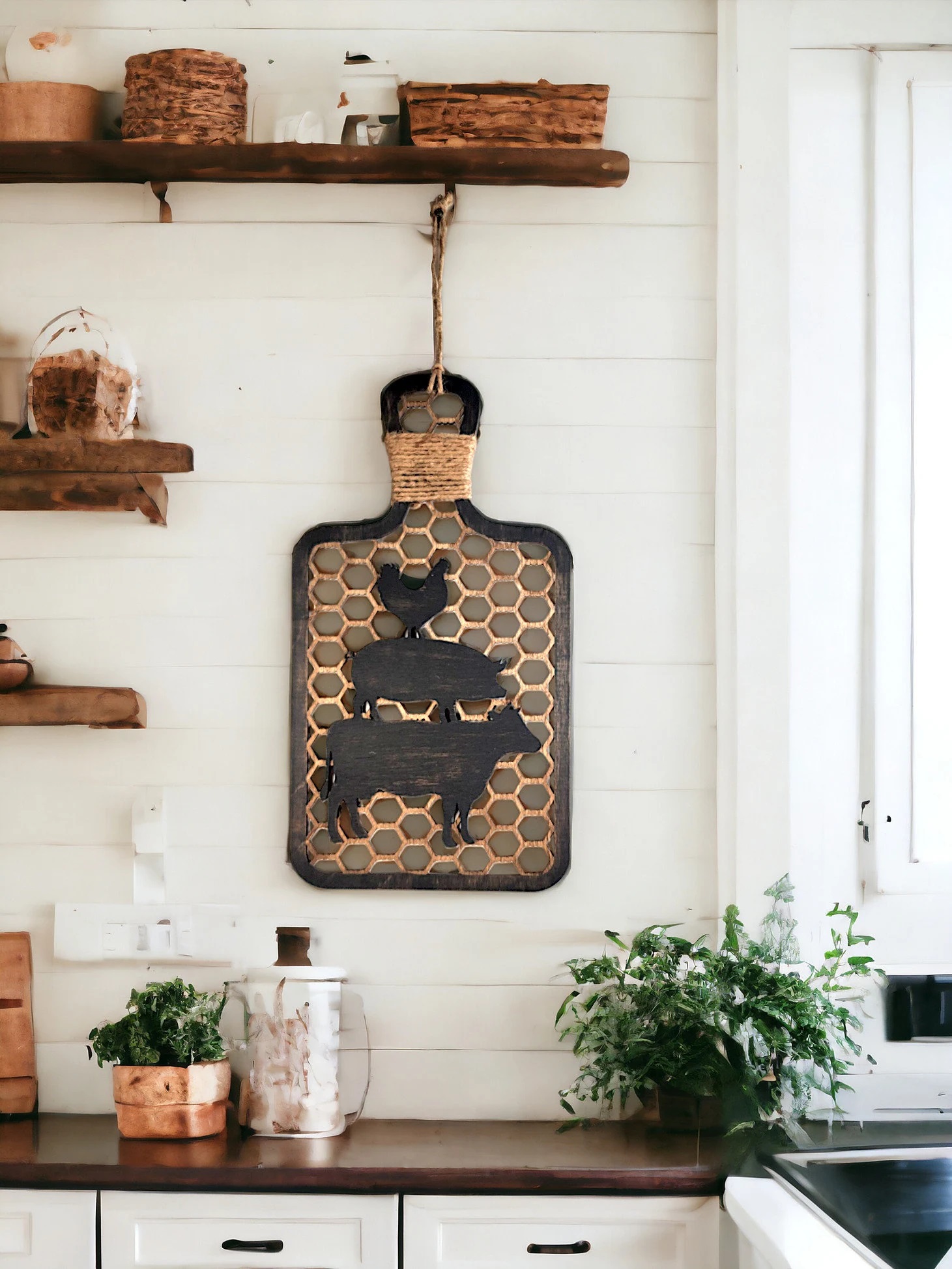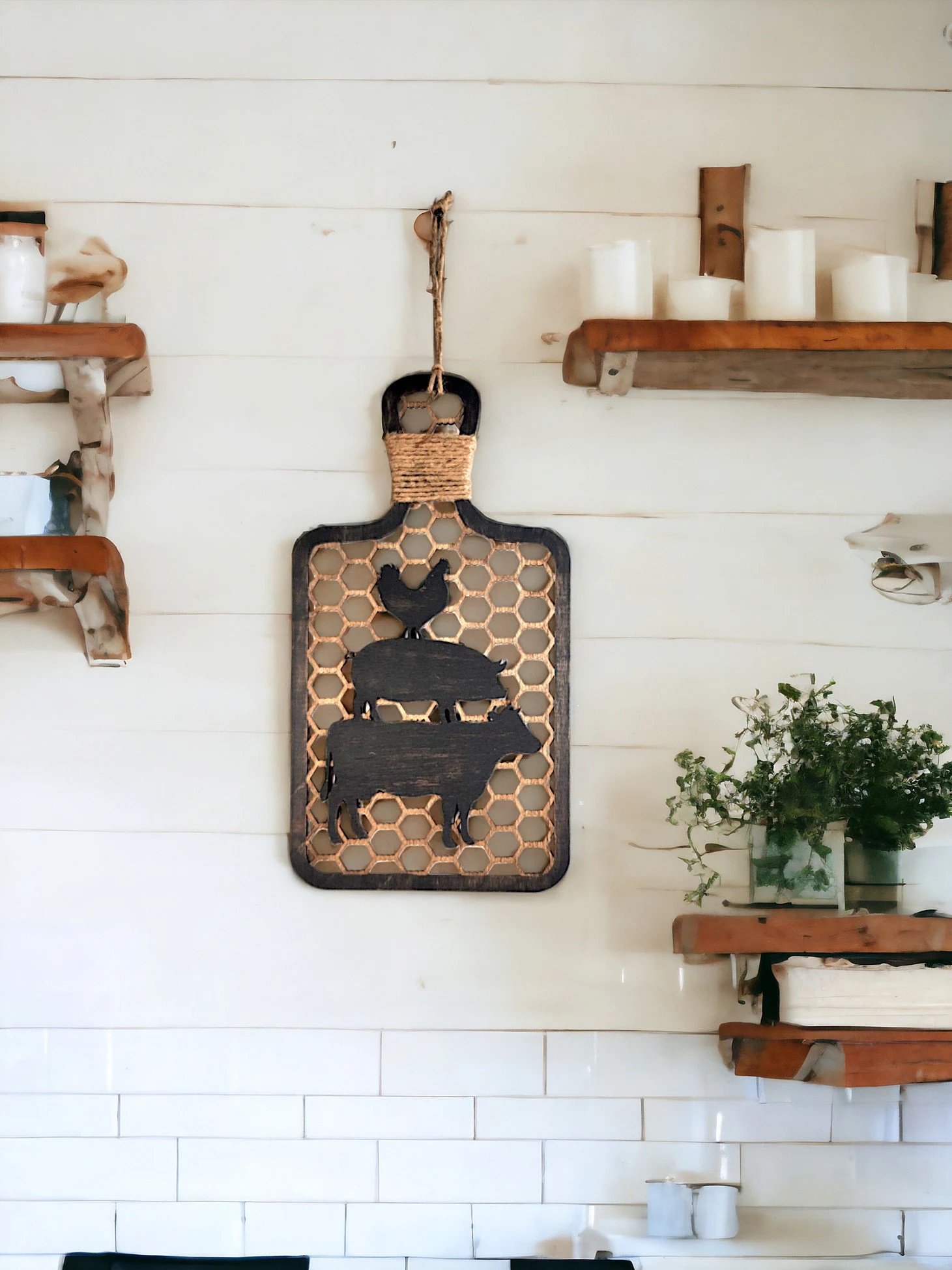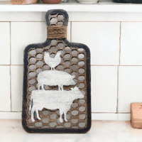 Add to your farmhouse look with this rustic farmhouse style decorative wood cutting board. From the look alike chicken wire to the down home stacked farm animals, it is sure to be a great addition to your decor!
